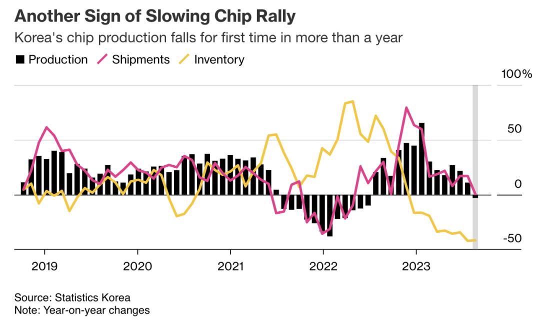 根据彭博社引述韩国政府统计局周四发布的数据显示,9月份,韩国全国半导体产量下滑3%,与上月增长11%相比出现大幅逆转。出货量增幅也从8月份的17%放缓至0.7%。这是韩国芯片产量14个月来首次下降。考虑到他们在芯片行业的特殊位置,这带来了不好的一个信号。
